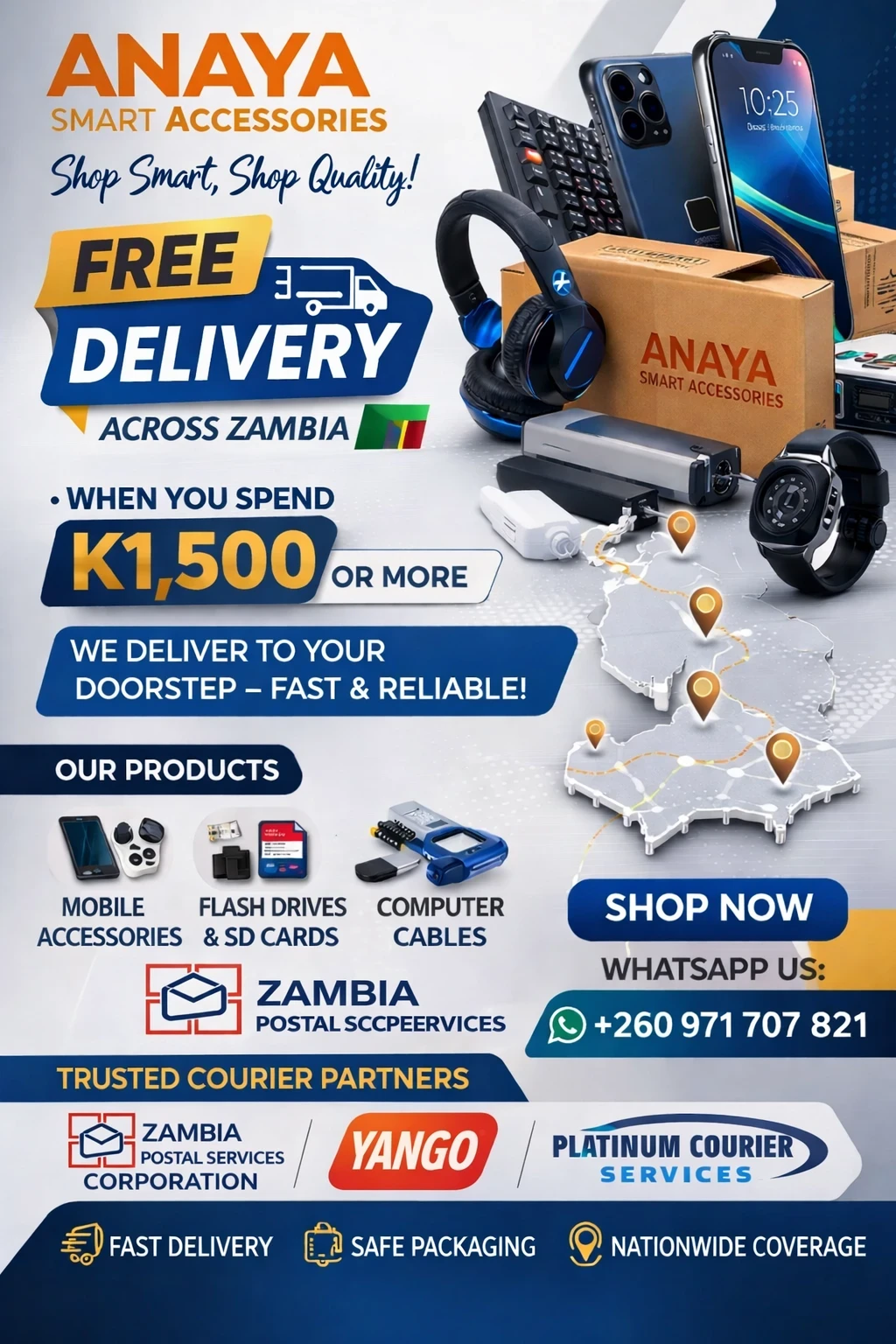 Enjoy free delivery across Zambia when you spend K1,500 or more — fast, reliable, to your doorstep. Free Delivery Across Zambia X