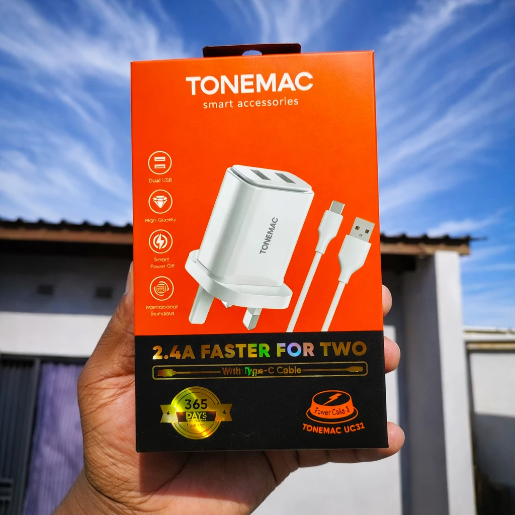 Tonemac UC32 Fast Charger with 2 USB ports delivers safe and stable power for Android and iPhone devices. Features a 3-leg UK pin plug for reliable and convenient charging, DC 5V-2.4A ( 12W MAX )