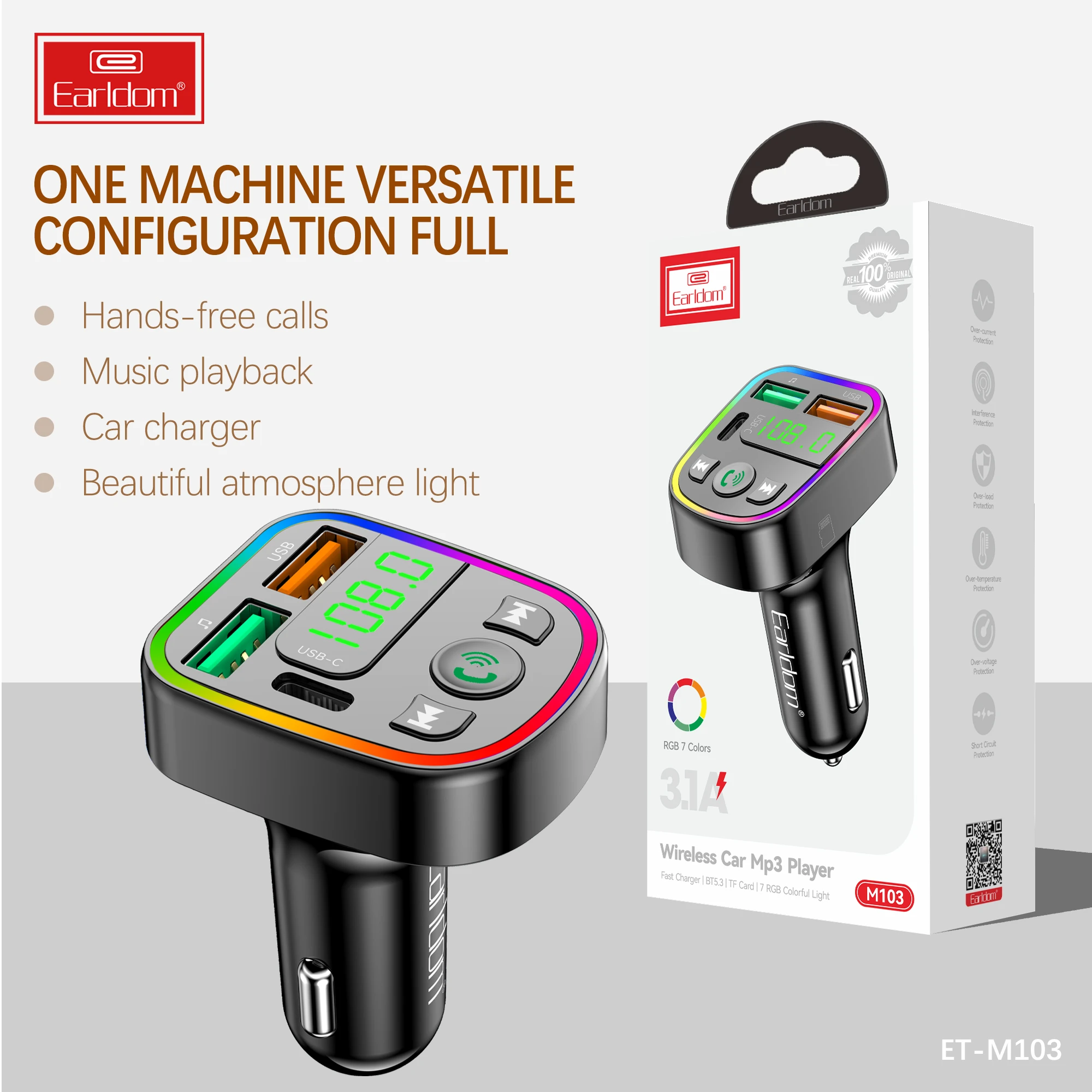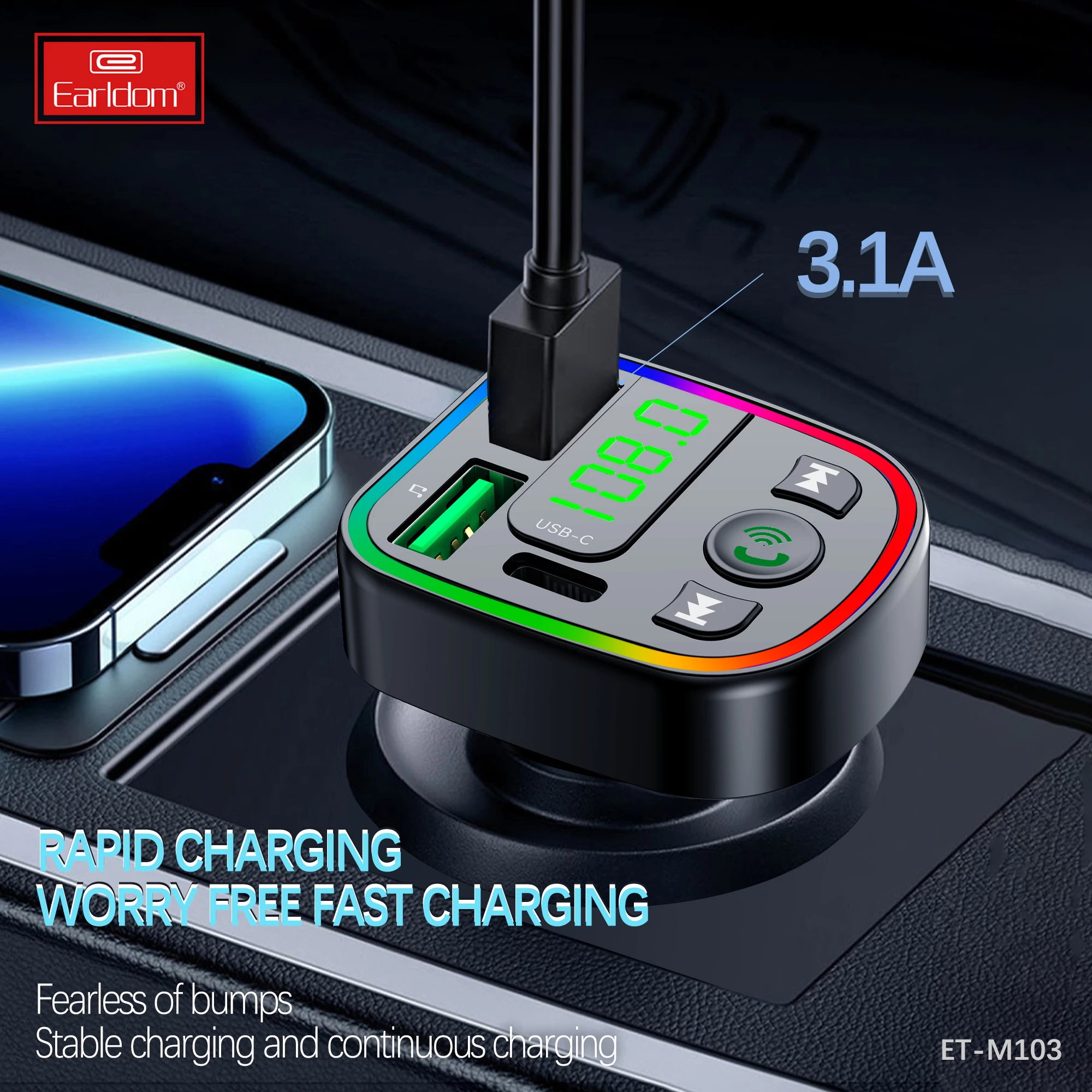 Earldom Bluetooth Modulator ET-M103 with Type-C port for wireless music streaming and hands-free calls in your car. Clear sound and fast, stable connection.
